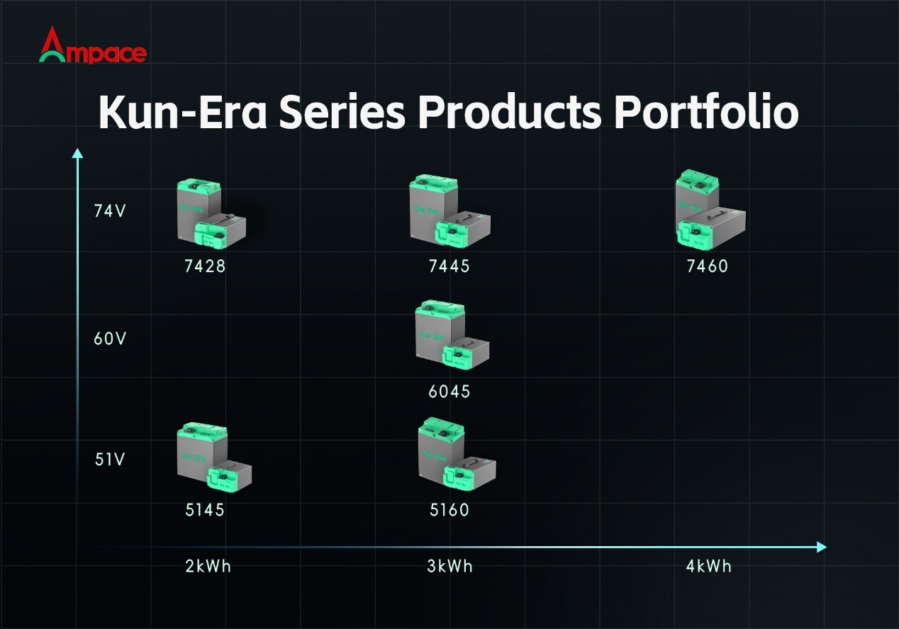 Powered by Ampace's 6 core technologies of the BP system: "ultimate safety, superb power, ultra-long cycle life, lightweight design, multi-pack parallel, and high adaptability", the Kun-Era series of products have been comprehensively upgraded in charge gradient, voltage platform, and adaptability to e-motorcycle models through innovation. This enables Kun-Era series to adapt to the diversified e-motorcycle travel scenarios.