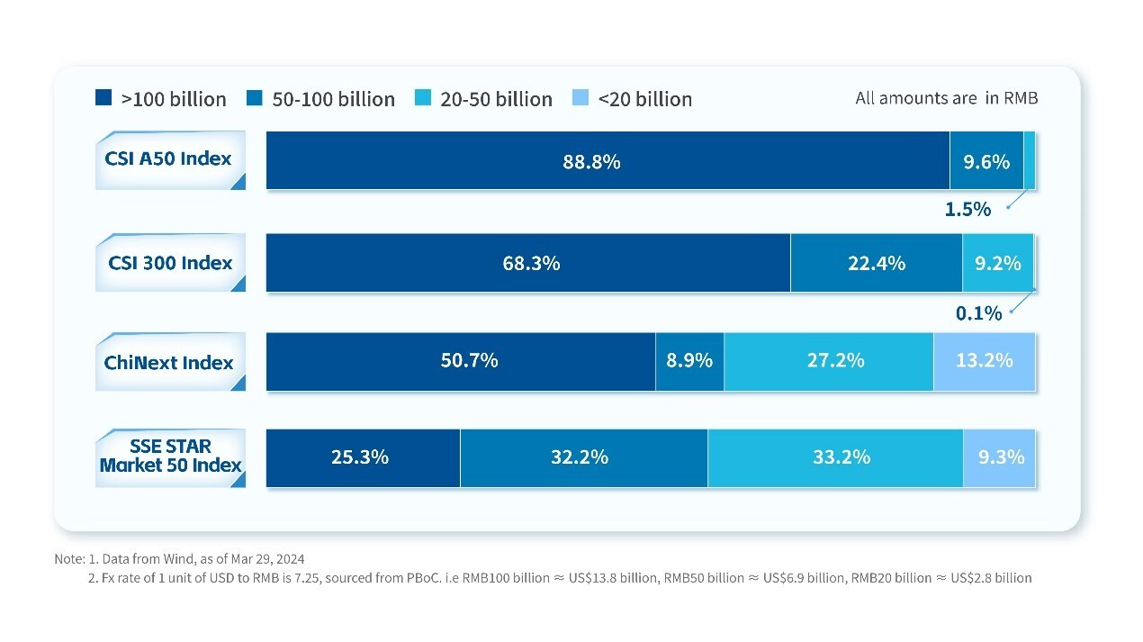 Although both CSI 300 index and CSI A50 index are representatives of large-cap stocks, with an average market cap of US$18.5 billion and US$35 billion, CSI A50 index unleashed opportunities to invest in mega-caps that 89% of its constituents have a market cap over RMB100 billion (US$13.8 billion).