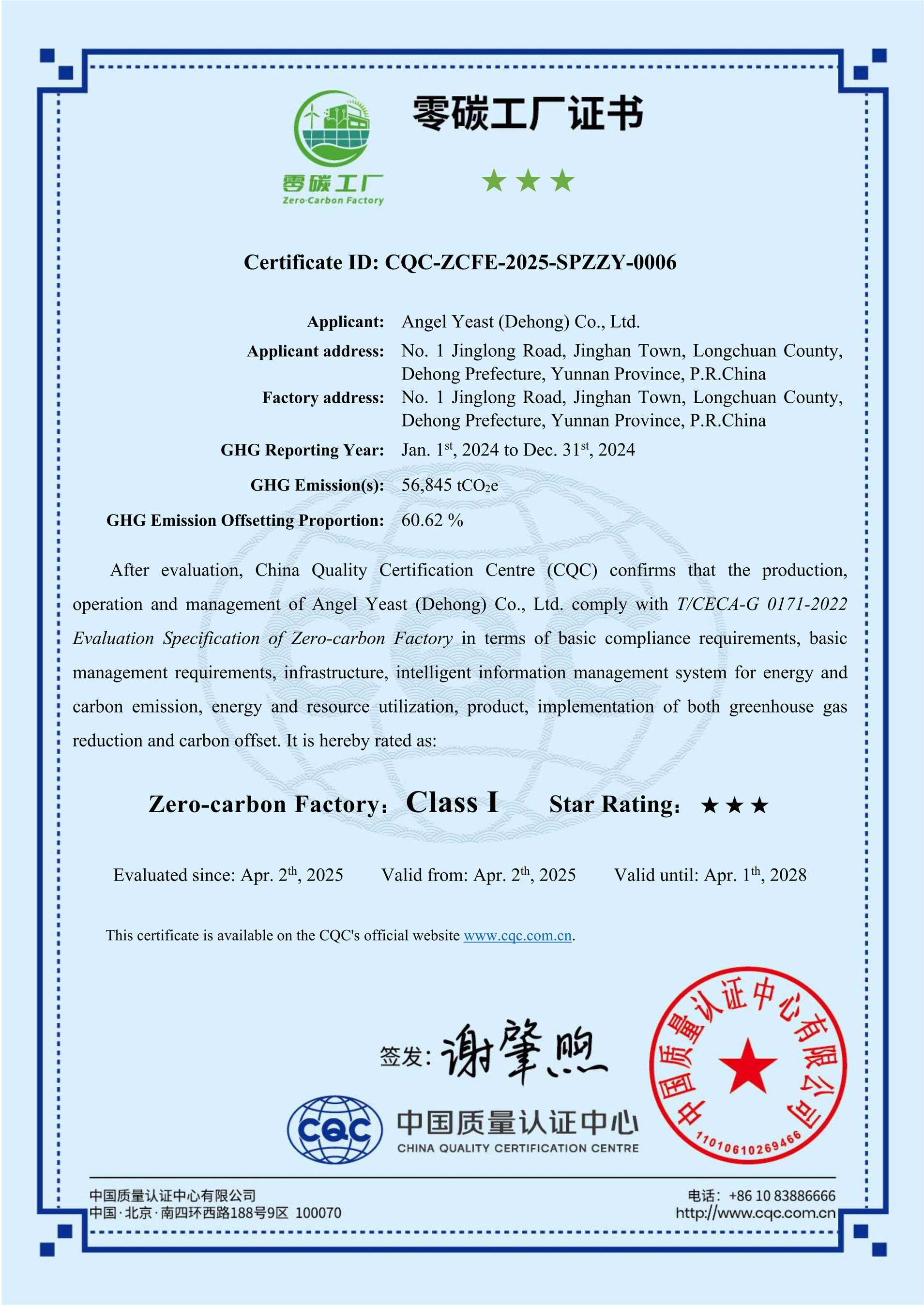 On April 2, Angel Yeast Dehong was officially designated as a Class I three-star "Zero-Carbon Factory" by the China Quality Certification Center. This milestone signifies Angel Yeast's first zero-carbon factory, marking a significant step in the company's dedication to green and low-carbon practices and promoting sustainable development.